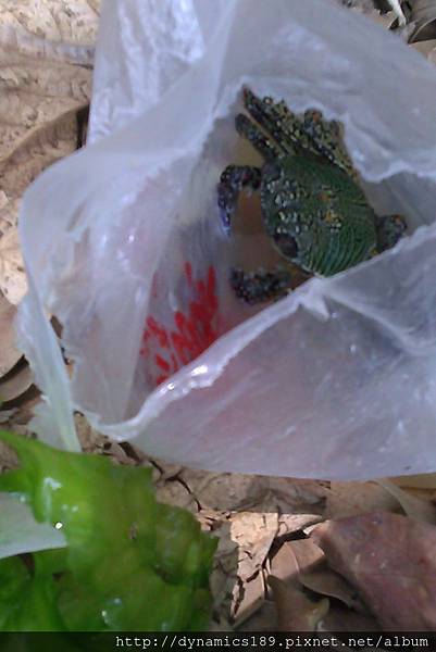 在岸上撿到一隻卡在塑膠袋的螃蟹,已經快曬死了,隨手撿起。